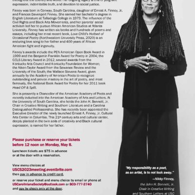 Nikky Finney, the award-winning poet, professor, and South Carolina native, will speak at the annual meeting of the University South Caroliniana Society on Saturday, May 13, at 12 noon. Luncheon menu choices and full details are at https://uscs2023meeting.eventbrite.com. Deadline to reserve or purchase tickets is Monday, May 8, at 12 noon.