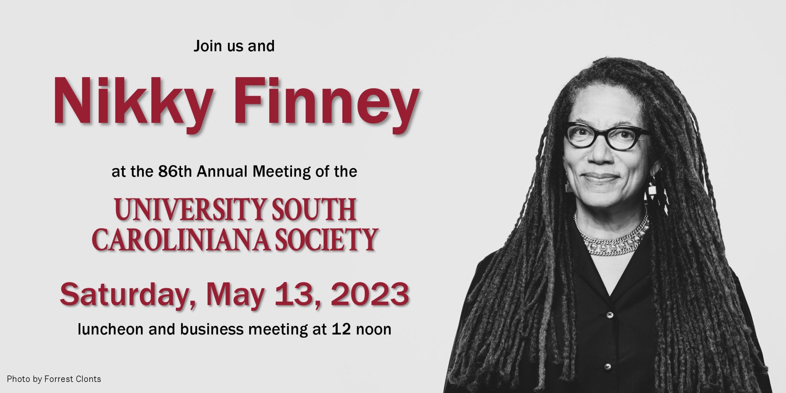 Nikky Finney, the award-winning poet, professor, and South Carolina native, will speak at the annual meeting of the University South Caroliniana Society on Saturday, May 13, at 12 noon. Luncheon menu choices and full details are at https://uscs2023meeting.eventbrite.com. Deadline to reserve or purchase tickets is Monday, May 8, at 12 noon.